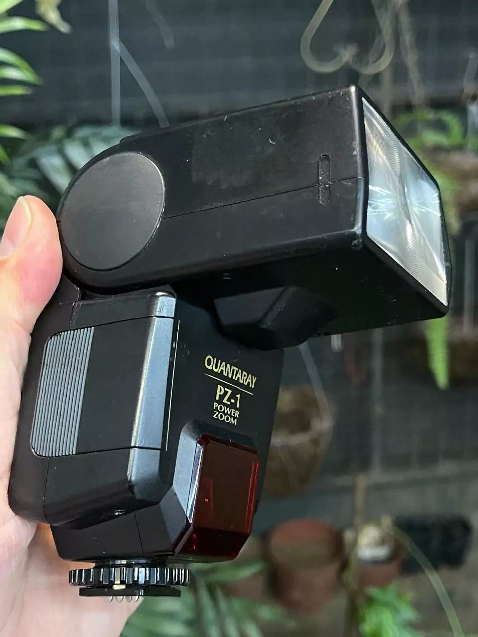 O Quantaray Flash faz medição de flash TTL que produz exposições precisas. O flash PZ-1 tem uma cabeça oscilante e giratória, uma opção de sincronização de cortina frontal ou traseira e um segundo flash menos potente que é usado quando o flash é rebatido e um Auto -off para economizar energia da bateria. Requer 4 pilhas AA de 1,5 volts (não inclusas)