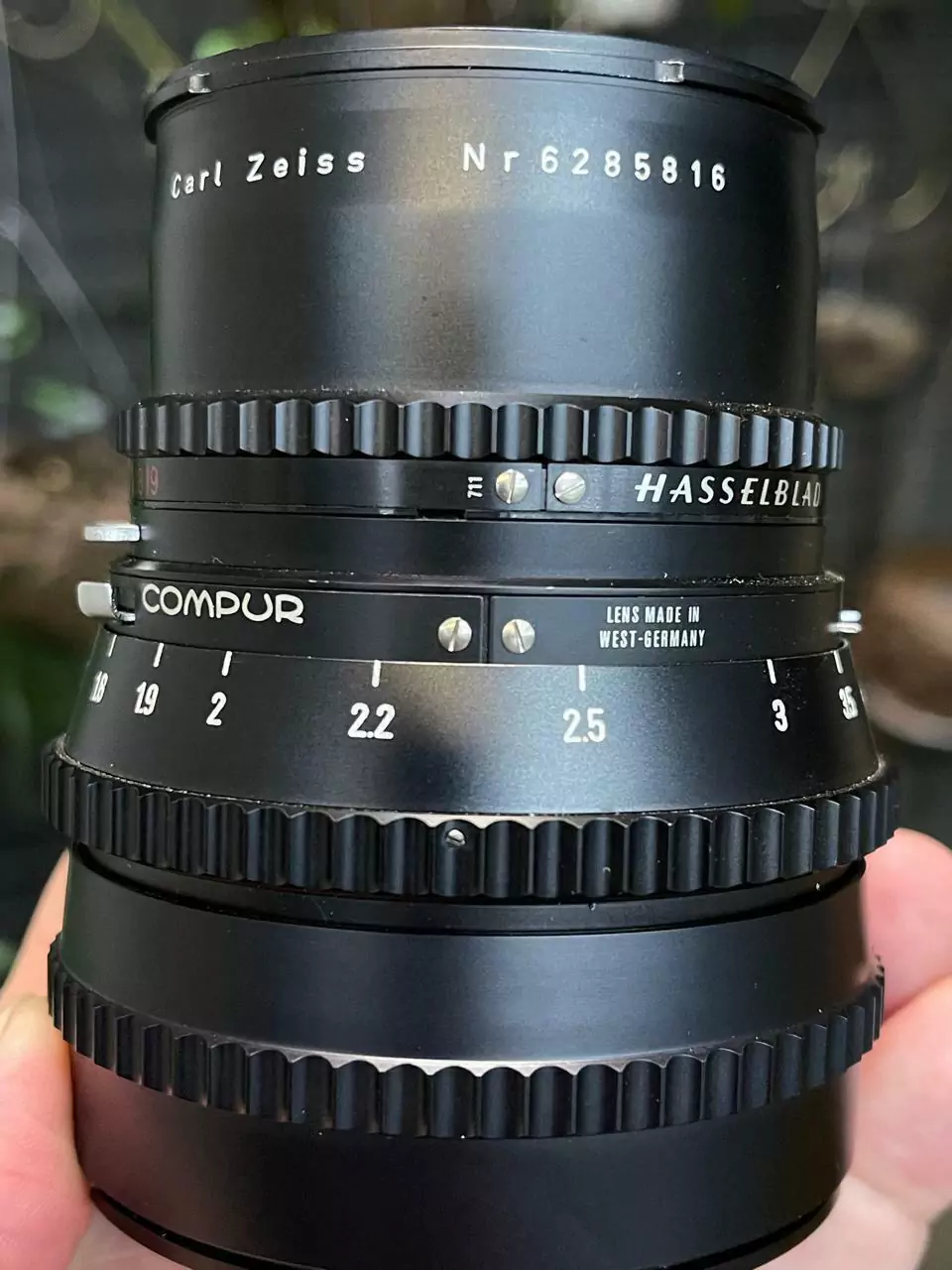 Lente normal de foco manual feita para câmeras SLR de médio formato do sistema Hasselblad V.